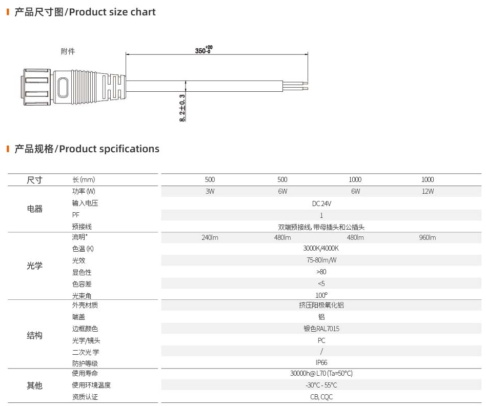 ●兩種尺寸,三種功率500mm and 1000mm●兩種色溫可選3000K/ 4000K