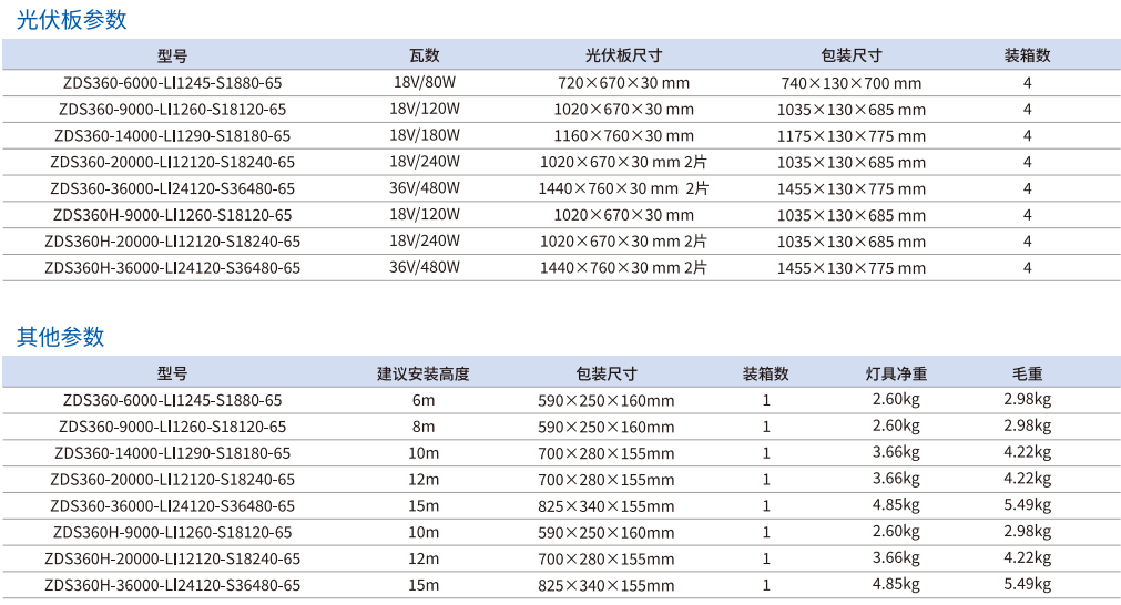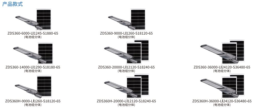 有離網(wǎng)和混合類型可供選擇,產(chǎn)品名稱中帶有H表示可以連接交流電的混合版本。安裝時(shí)只需將燈具固定在燈柱上,讓發(fā)光面精準(zhǔn)朝向待照明的路面,同時(shí)將太陽(yáng)能板對(duì)準(zhǔn)太陽(yáng)即可。五種流明選項(xiàng)-6000、9000、14000、20000、36000流明